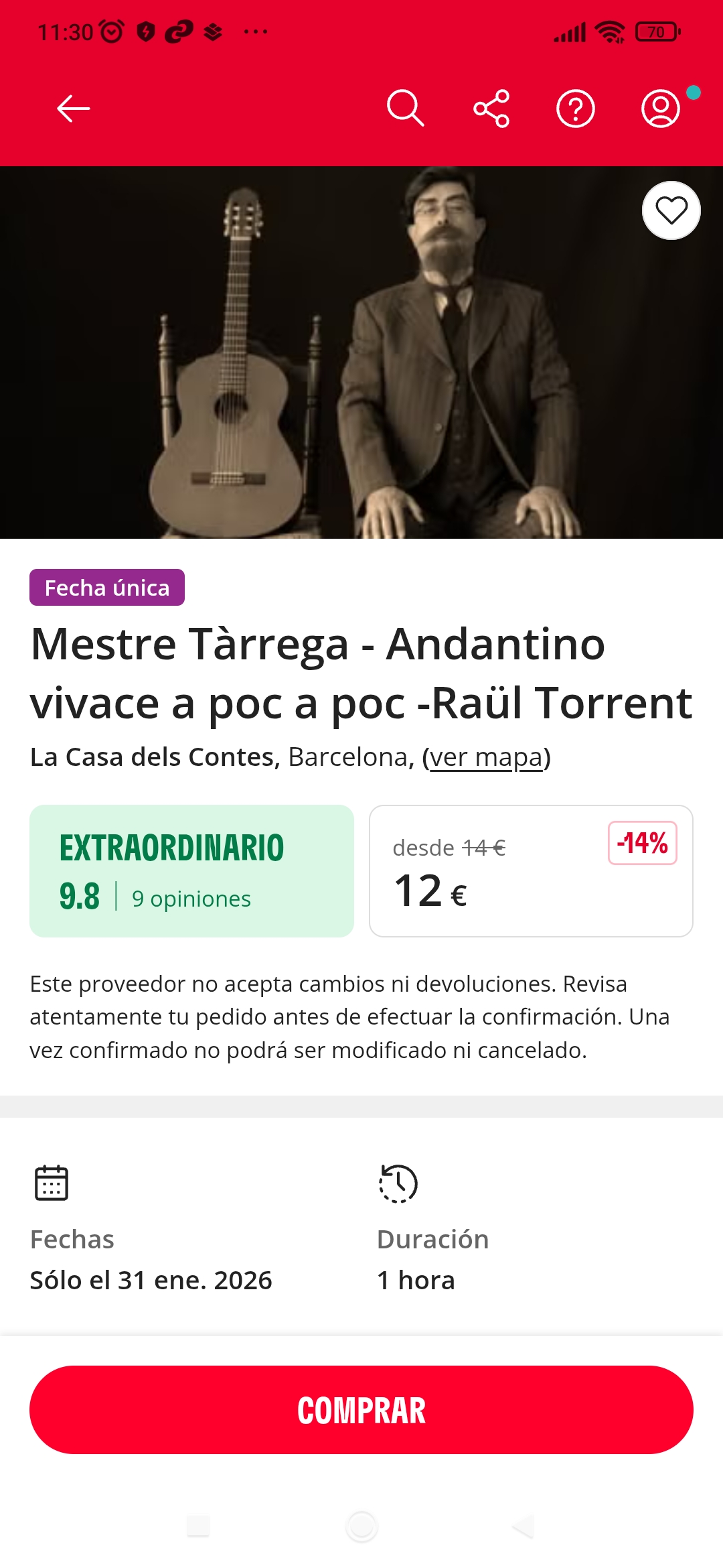 Raül Torrent, maestro de “la medida”, facetea su pieza con humor y precisión de joyero. Verán con placer en este homenaje a la guitarra española y también a Barcelona cómo el humilde niño prodigio Francisco Tàrrega, con sus aventuras “sin cuento”, se convierte en el compositor y concertista de las más renombradas piezas para guitarra de la historia.